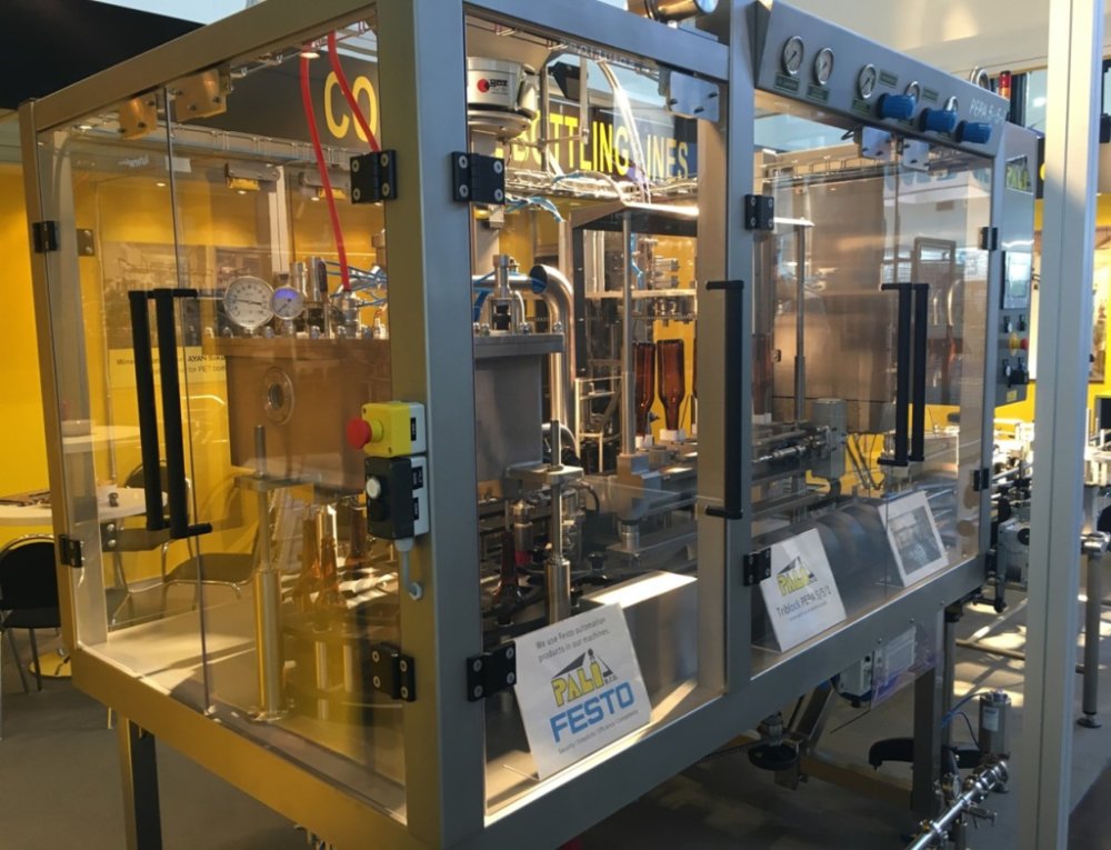 Номинальная производительность 500 бутылок в час – объема 0,5 литра. Новая конструкция машины, модерные разливные краны, совершенный эффект санитации в закрытом цикле.